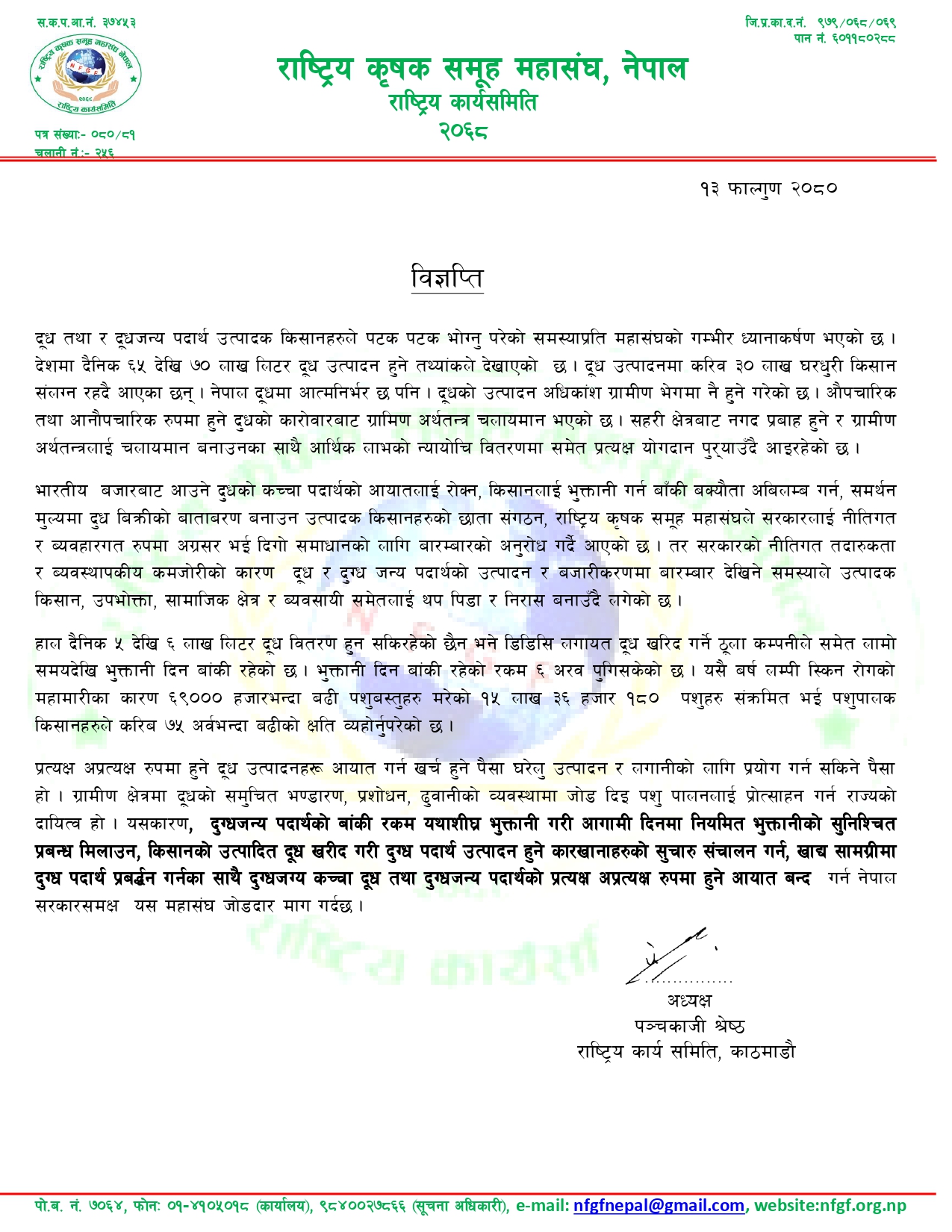 Demand to pay the remaining amount of dairy products as soon as possible and make sure arrangements for regular payment in the future